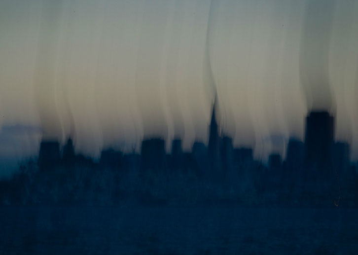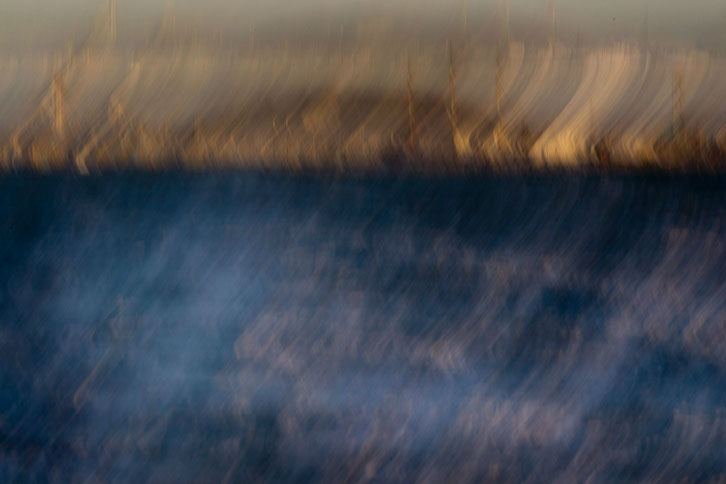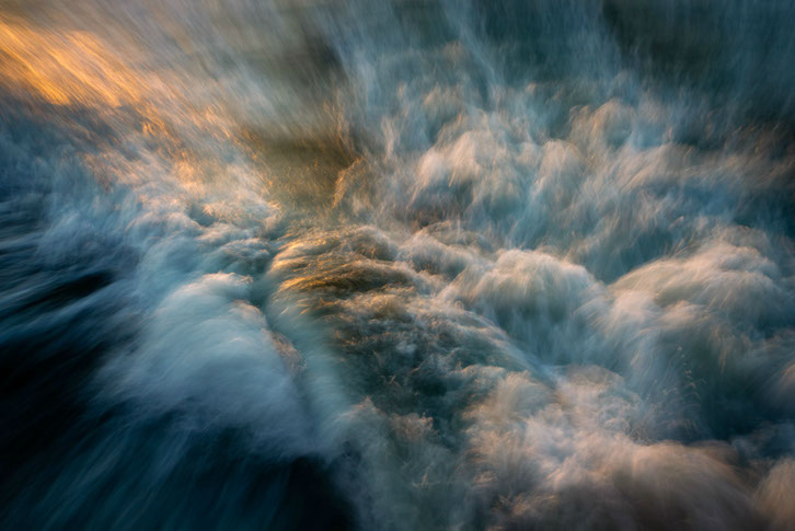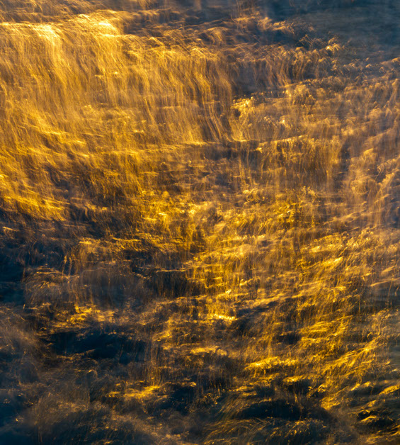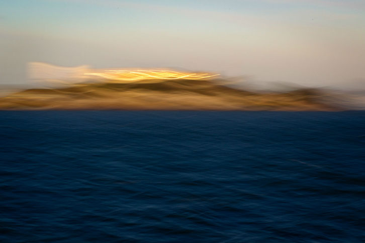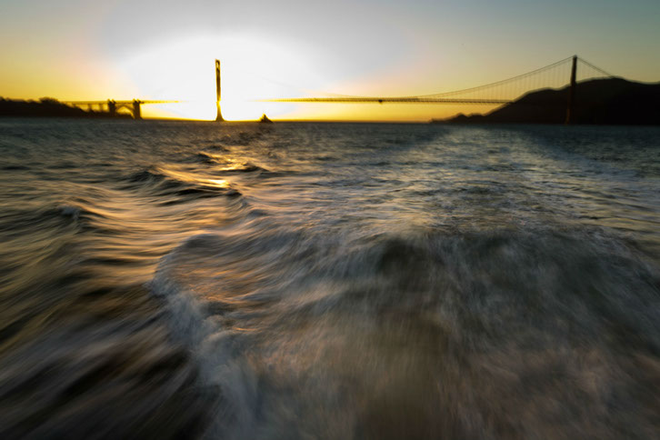 Taken from a bay ferry, the roiling water left behind catches the last light from the setting winter sun. San Francisco, CA.