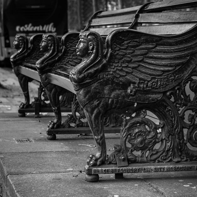 Cast iron benches with a Sphinx motif. Installed around 1878 on the Embankment and coinciding with the unveiling of Cleopatra's Needle.