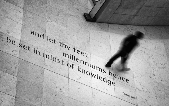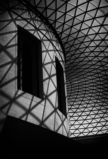 The Norman Foster designed roof casts a complex shadow onto the rotunda building. Central courtyard, British Museum.