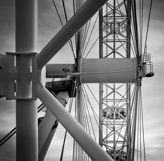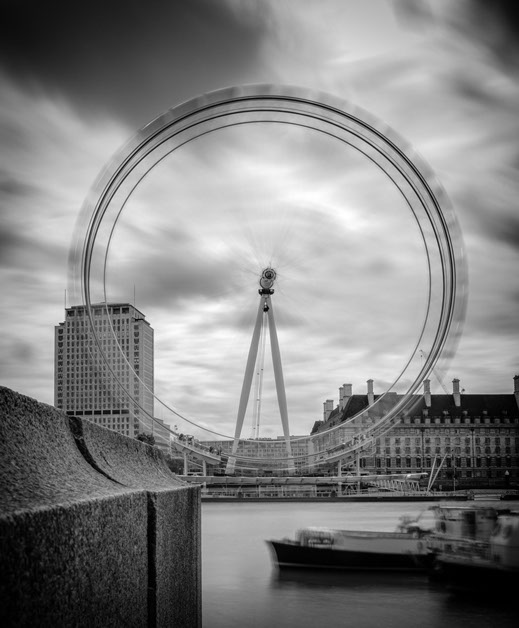Long exposure shot of the London Eye as it spins slowly round on a grey, rainy day.