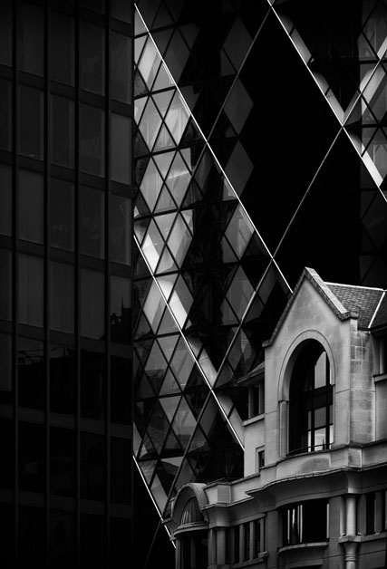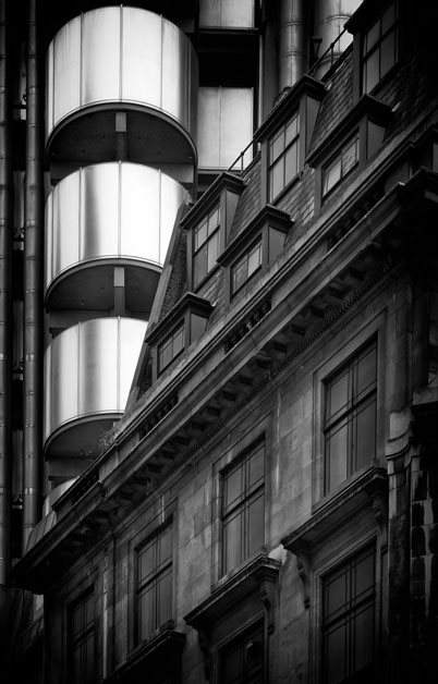 Lloyds Insurance building looms over a Victorian neighbour. City of London.