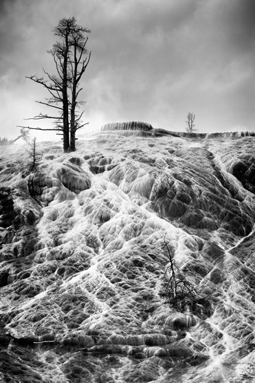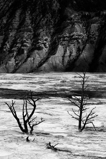 Two blackened trees stand out against a salt encusted plateau. Mammoth Springs area, Yellowstone.
