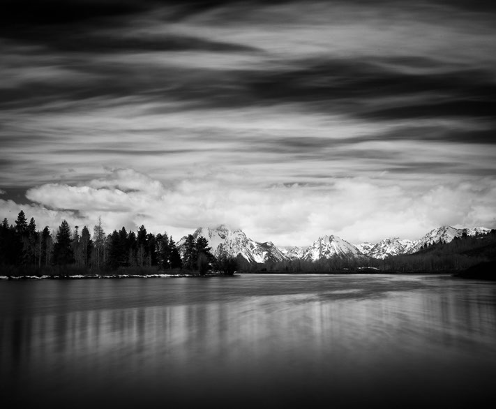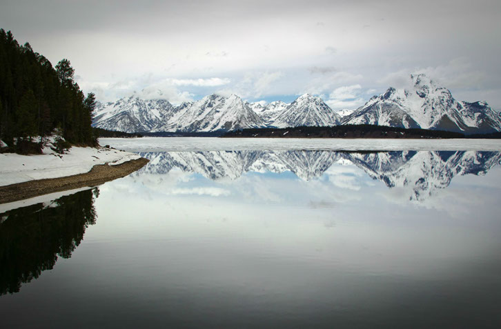 Looking across Jackson Lake, the mountain range and reflection produce a rythmic effect, emphasizing the tranquility of the park early in the spring season.