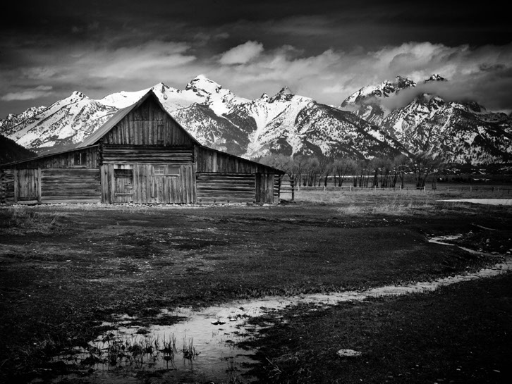An old barn, set just off Mormon Row, near Jackson, Wyoming, sits in front of the Grand Tetons mountain range.