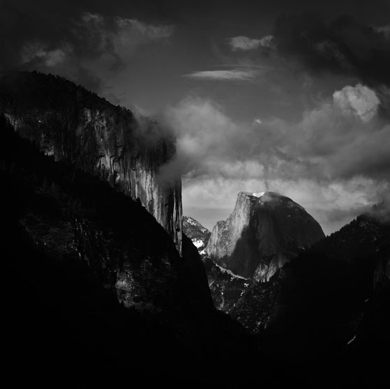 El Capitan resolutely refusing to come out from behind a veil of cloud, despite the gloom clearing from the rest of the valley. Yosemite National Park, Valley Viewpoint.