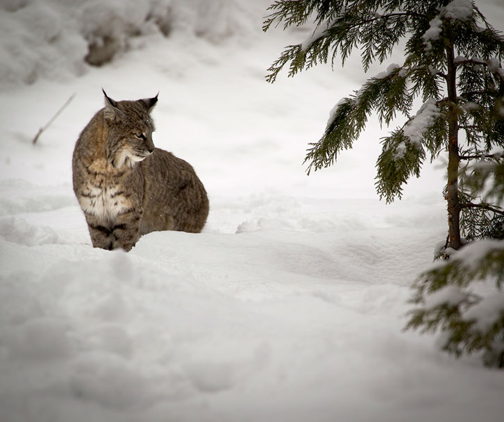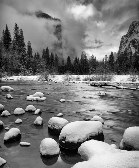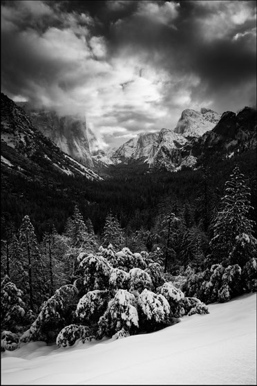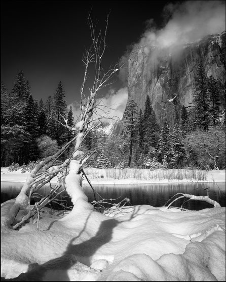 Snow-covered tree stretching out towards Cathedral Rocks, Yosemite Valley, CA.