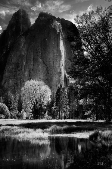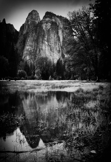 View across the waterlogged Yosemite Meadows towards Cathedral Rock.