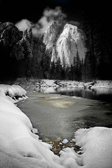 Ice clings to the edge of the river bank in the Swinging Bridge area of Yoesmite National Park, CA.
