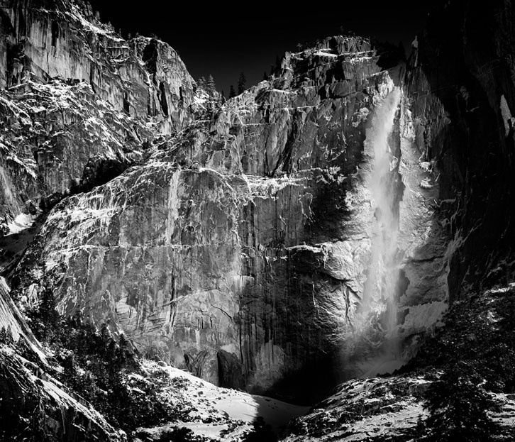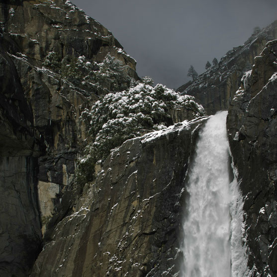 In the cold of a Yosemite winter, what starts out as a waterfall soon becomes a snowfall! The air was cold enough that the water refroze on the way down, forming a pile of snow by the time it reached the bottom of the cliff.